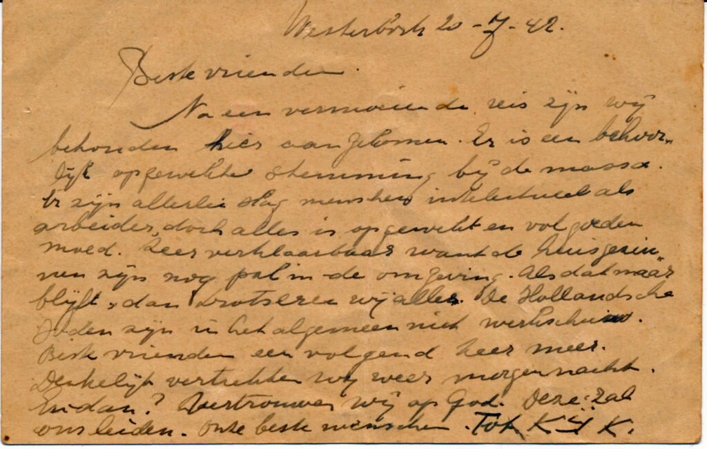 Beste vrienden, Na een vermoeiende reis zijn wij behouden aangekomen. Er is een behoorlijk opgewekte stemming bij de massa. Er zijn allerlei slag menschen, intellectuelen als arbeiders, doch alles is opgewekt en vol goeden moed. Zeer verklaarbaar want de huisgezinnen zijn nog pal in de omgeving. Als dat maar blijft, dan trotseren wij alles. De Hollandsche Joden zijn in het algemeen niet werkschuw. Beste vrienden een volgend keer meer. Denkelijk vertrekken wij weer morgennacht. En dan? Vertrouwen wij op God. Deze zal ons leiden. Onze beste wenschen. TOT KIJK.